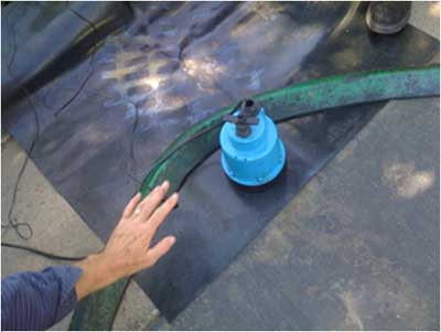 Next you place the pump inside of the U-shaped dam and hook one end of the hose to the pump.